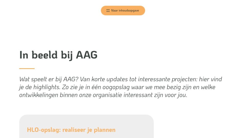 Wat speelt er bij AAG? Van korte updates tot interessante projecten: hier vind je de highlights. Zo zie je in één oogopslag waar we mee bezig zijn en welke ontwikkelingen binnen onze organisatie interessant zijn voor jou.